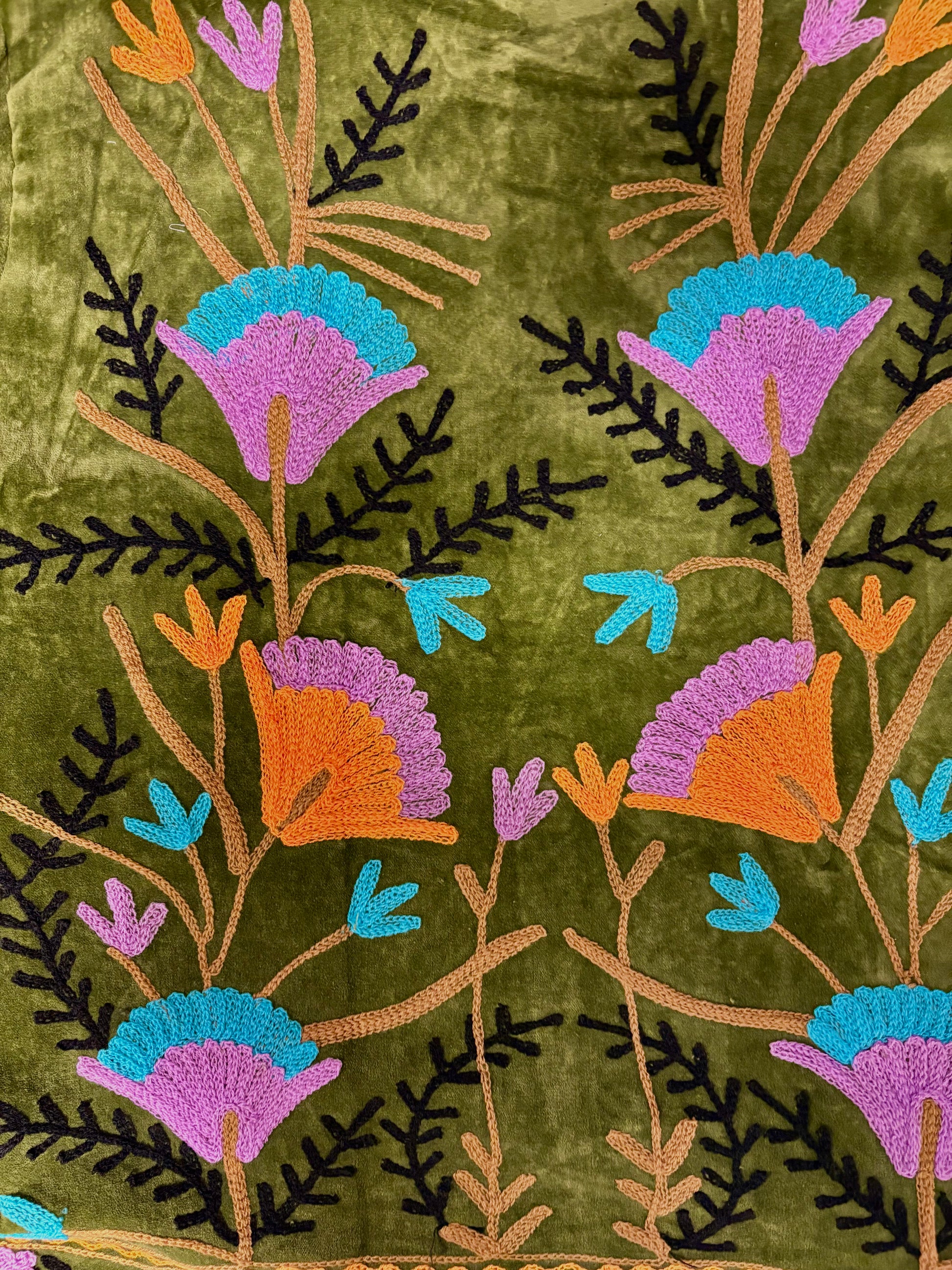 A jacket that feels like a treasure. This velvet layer is richly detailed with hand embroidery, giving each piece a one-of-a-kind, artisanal feel. Made in India by skilled makers, it has a soft, luxurious drape and just the right amount of structure. Fully lined with a playful gingham print, it’s as charming on the inside as it is on the outside. And yes—there are pockets, so your hands and little essentials are covered.