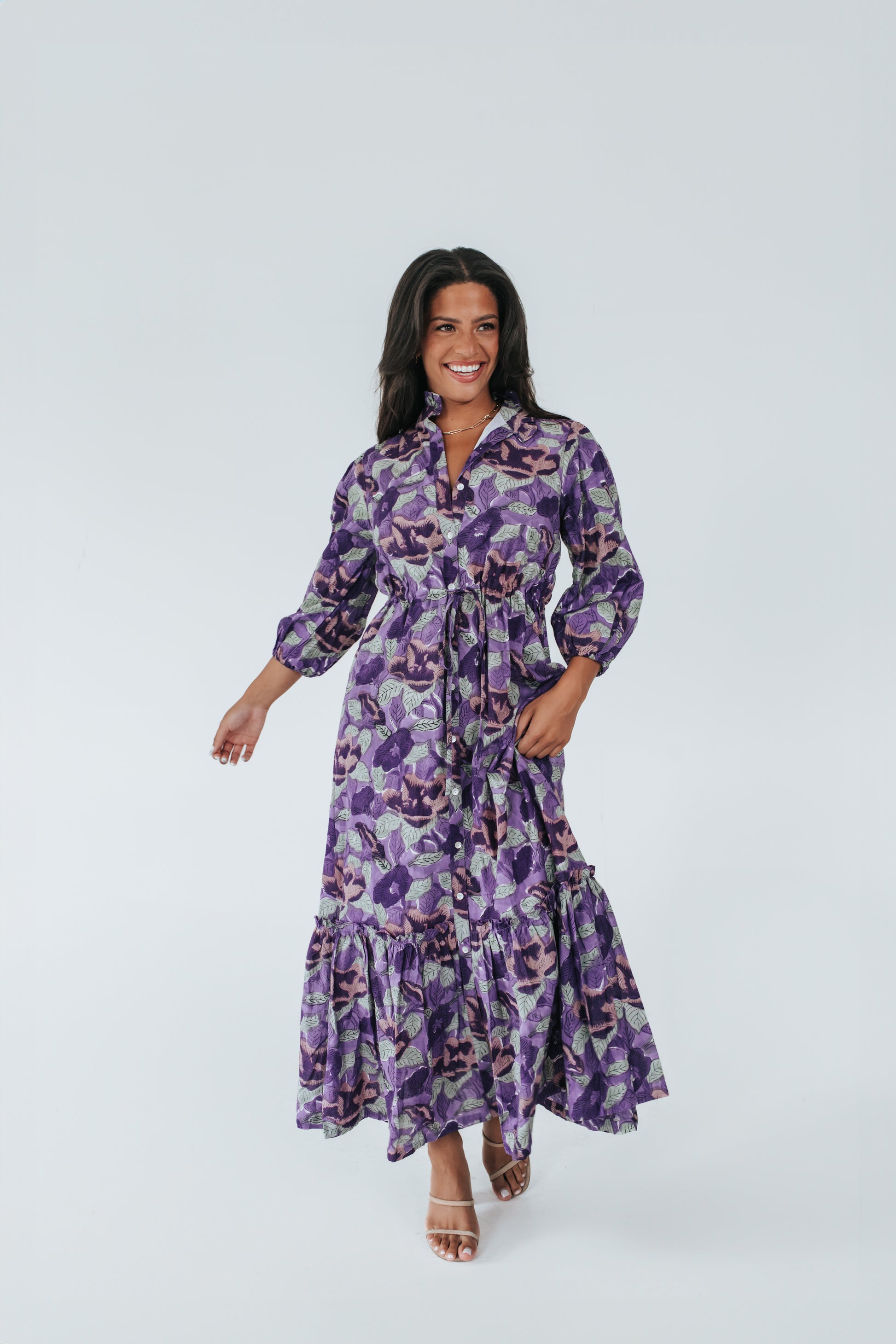 Timeless, tailored, and effortlessly feminine — meet The Morgan Dress. Made from 100% cotton, this full-length stunner features a classic button-front design with a flattering drawstring waist for a customizable fit. The ruffled high collar and tiered hem add soft structure and romantic movement, while the ¾-length sleeves make it a versatile piece you can wear any season.
